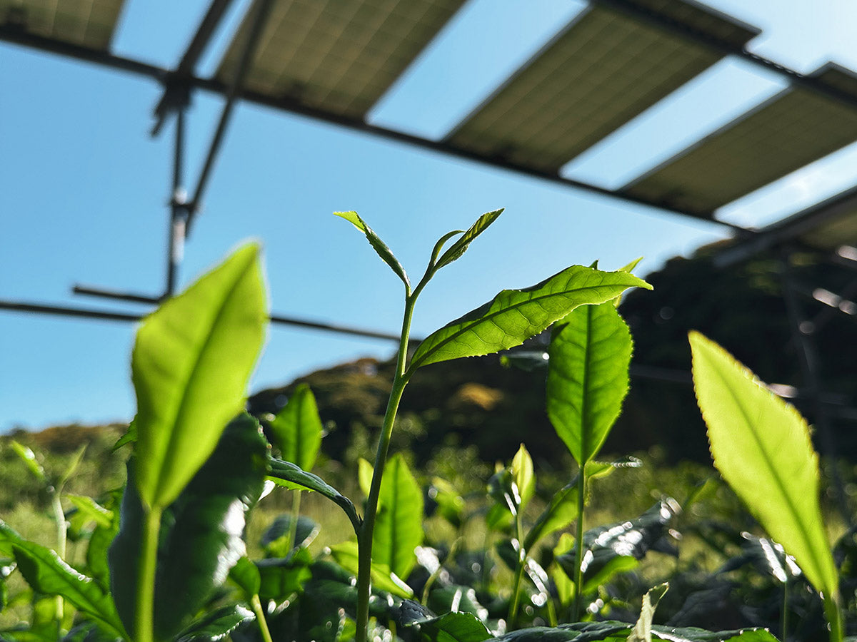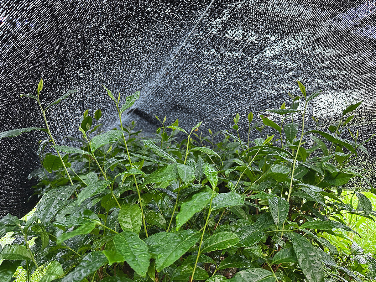 茶葉は収穫前の約4週間、寒冷紗(かんれいしゃ)による被覆を行います。布を葉に直接かけるのではなく、茶樹の上に張ることで、風と湿度の循環を保ちつつ、クロロフィルの生成や、旨みのもととなるアミノ酸の蓄積を促します。