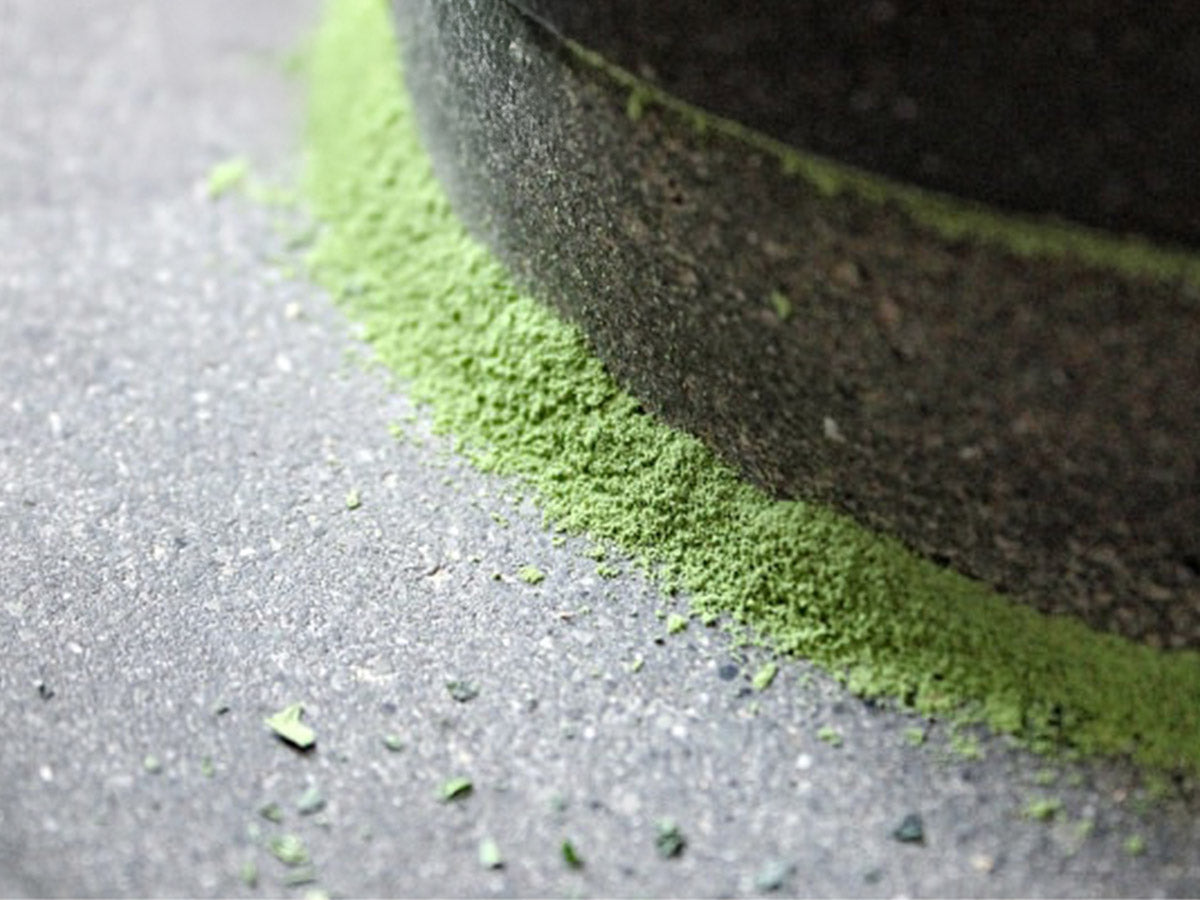 石臼挽きは、時間と手間を惜しまない、非常に繊細な工程です。40gの抹茶を挽き上げるのに、およそ1時間を要します。ゆっくりと挽くことで熱の発生を抑え、香りや色合い、栄養成分を損なわずに保ちます。